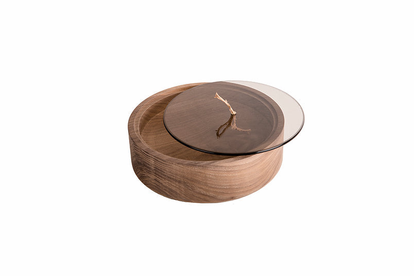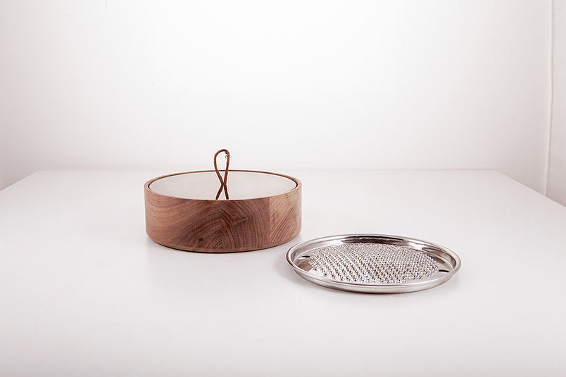 E' una funzionale grattugia di forma circolare, abbinata ad una scatola in legno noce canaletto provvista di un coperchio in vetro temperato con un anello in cuoio come pomolo.