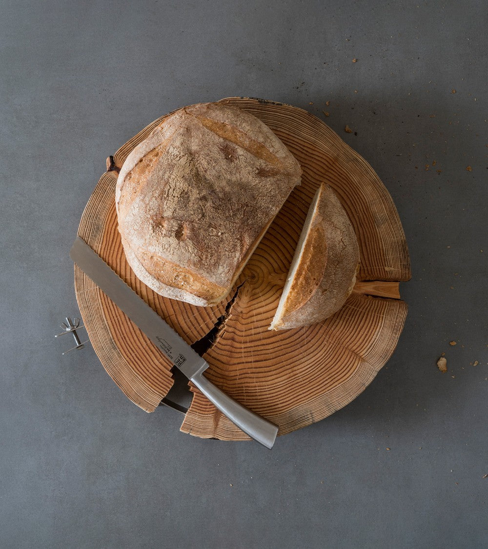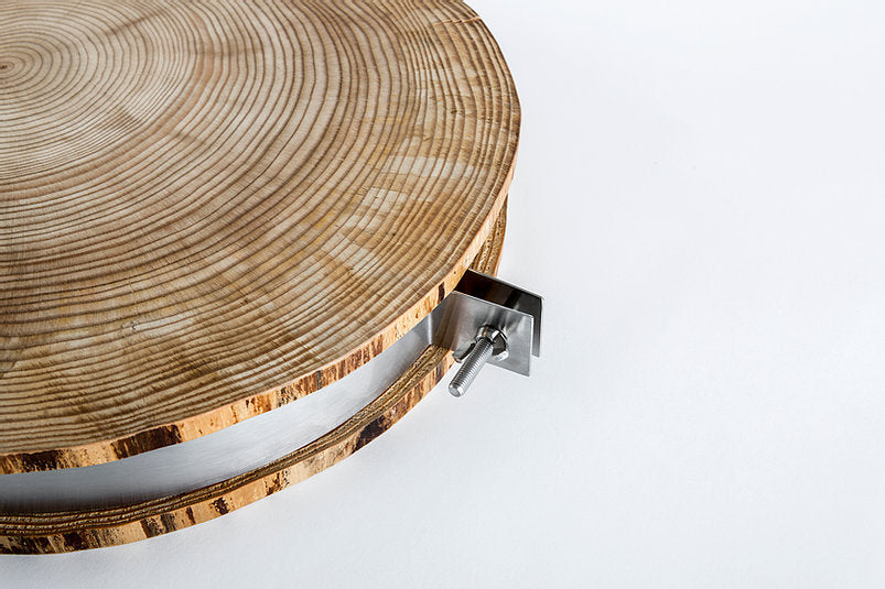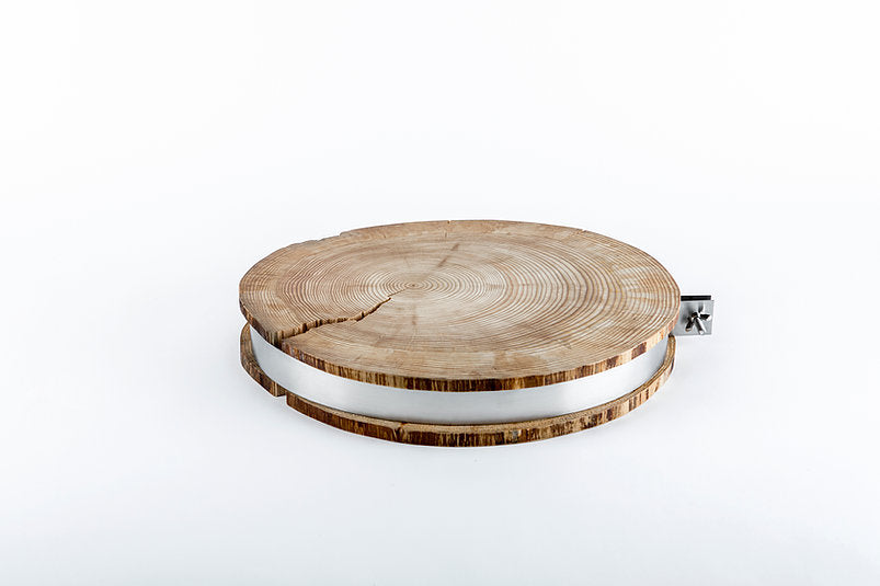 Un oggetto dall’aspetto essenziale, quasi l’archetipo di tutti i taglieri: una semplice sezione di legno che conserva tutta l’essenza materica della sua origine, dove è possibile verificare l’età della pianta da cui proviene contandone gli anelli di accrescimento. Lungo il bordo vi è una scanalatura in cui una lamina di acciaio funge da rinforzo della struttura: il risultato è di una semplicità perfetta! Per affettare il pane, e non solo.