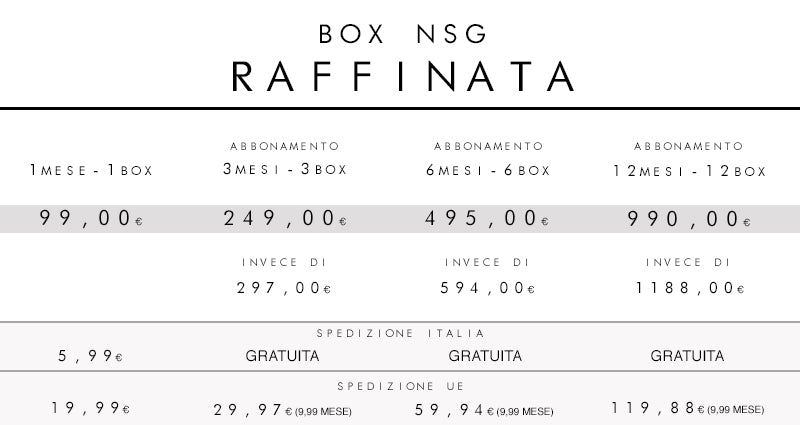 Scegli la box RAFFINATA di NSG CONCEPT STORE e riceverai una scelta favolosa di articoli sempre diversi e stilosi.