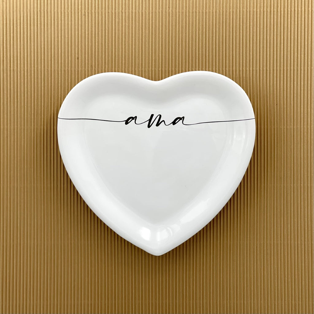 Piatto a cuore, in ceramica della linea CALLIGRAFA di FIORDITERRA. La perfezione delle proporzioni del cuore unite alla "bella grafia" della scritta AMA, rendono questo piatto indicato a contenere dolci, cioccolatini, snack ma anche biglietti da visita o coordinato alle tazze e tazzine della stessa linea.