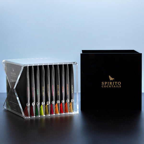 Semplicemente, l'idea regalo perfetta per gli appassionati di mixology e per tutti coloro che amano arricchire la propria casa con splendidi oggetti di design! Un cofanetto di design in plexiglass con cassetto estraibile per riporre ed esporre i tuoi drink 10 drink preferiti.