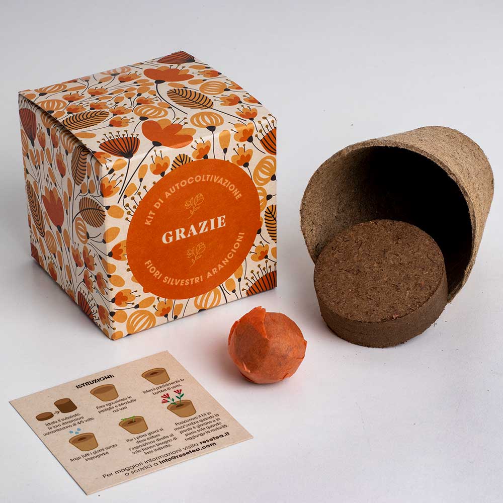 Il kit contiene 1 vaso di germinazione 100% biodegradabile, 1 compressa di terreno e 1 bomba di semi con fiori selvatici arancioni (calendula, nasturzio e tagete).