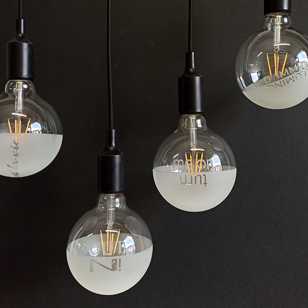 La Tattoo Lamp è la linea di lampadine FILOTTO con vetro schermato da scritte o simboli grafici con il doppio obiettivo di aumentare il confort visivo riducendone o azzerandone l’abbagliamento. Il pallino è un gioco estetico che rende la lampada anche originale.