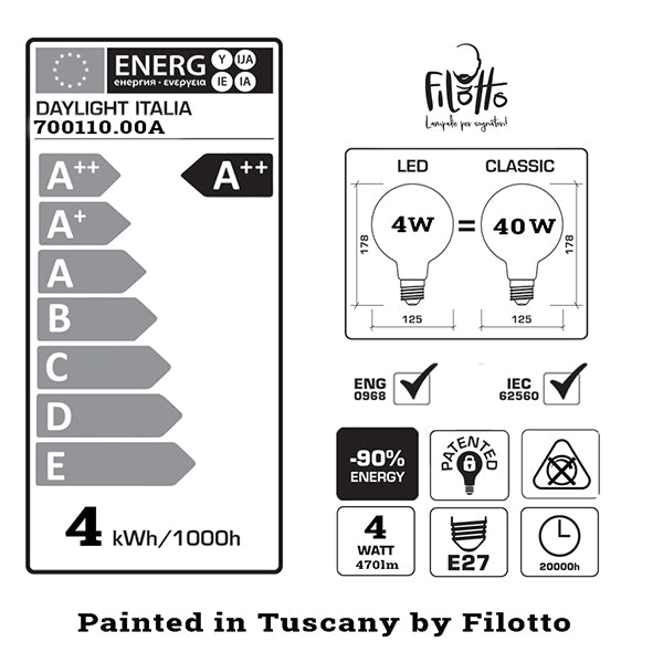 La lampadina è led a risparmio energetico con attacco adatto ad ogni portalampada della collezione FILOTTO.