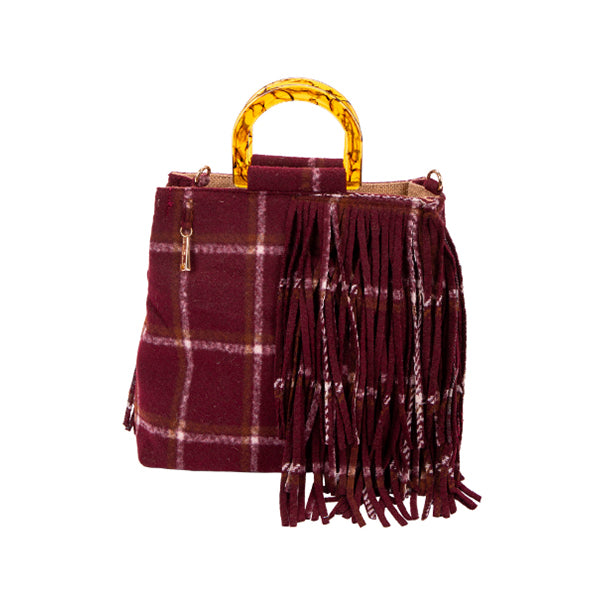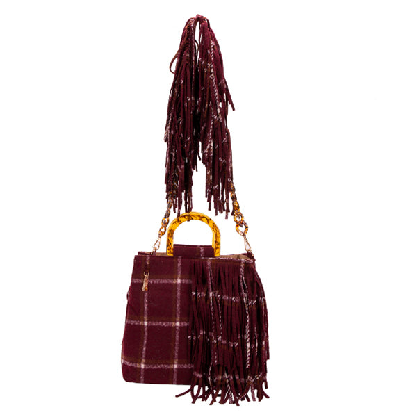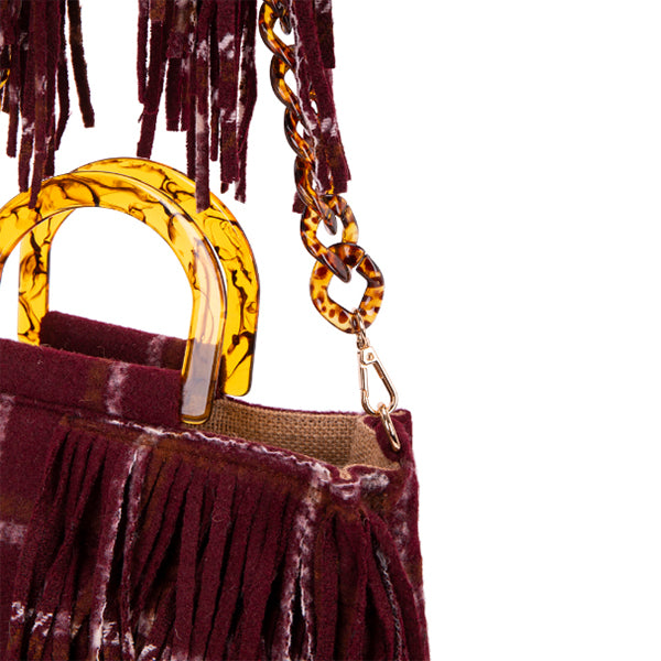 Un plaid scozzese di colore bordeaux, diventa una strepitosa borsa. All'interno uno scomparto unico con taschina a soffietto con logo applicato; la chiusura magnetica è nascosta e i manici sono in resina ed ha anche una tracolla in resina e lana con frange. L'esterno è in lana, l'interno in iuta.