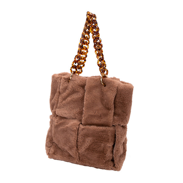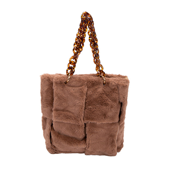 Una simpatica borsa in pelliccia sintetica in un caldo color marrone chiaro. All'interno uno scomparto unico con taschina a soffietto e logo applicato; la chiusura magnetica è nascosta e i manici a spalla in una leggera catena di resina. L'esterno è in faux fur, l'interno è completamente foderato.