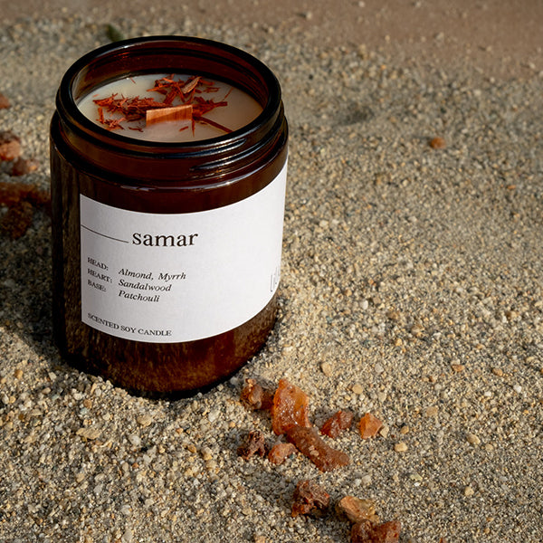 Samar è il racconto di un viaggio in tempi lontani avvolti in un alone di magia, dove gli amanti si uniscono al dialogo nell’ombra della luna. Come un tappeto volante, si viaggia tra le dolci note di mandorla e mirra che si uniscono a un cuore di sandalo e a un caldo fondo di patchouli.