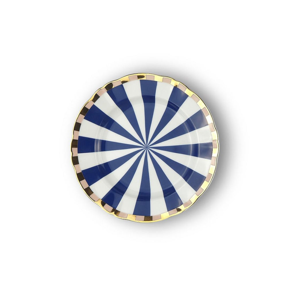 Fortuna, piatto in porcellana con dettagli e decalco d'oro. Fa parte della collezione ABRACADABRA di Bitossi Home: la collezione di piatti, tazzine ed accessori  per la tavola, è ispirata al circo ed alla magia, un trionfo di stelle, pois, losanghe, girandole e foliage illuminati da dettagli dorati.