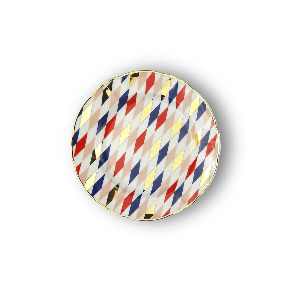 Quadri, piatto in porcellana con dettagli e decalco d'oro. Fa parte della collezione ABRACADABRA di Bitossi Home: la collezione di piatti, tazzine ed accessori per la tavola, è ispirata al circo ed alla magia, un trionfo di stelle, pois, losanghe, girandole e foliage illuminati da dettagli dorati.