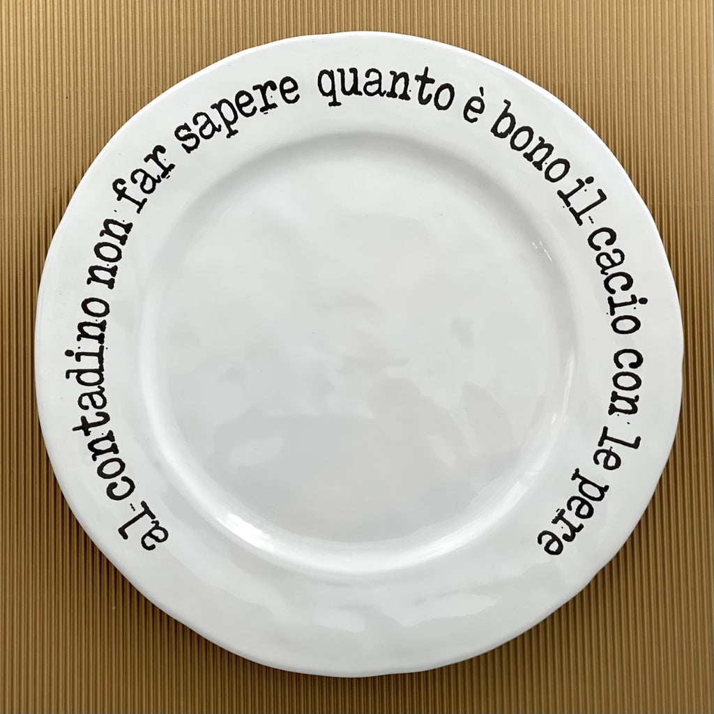 Piatto irregolare con scritta "AL CONTADINO NON FAR SAPERE QUANT'È BUONO IL CACIO CON LE PERE" per una tavola diversa dal comune e spiritosa.
