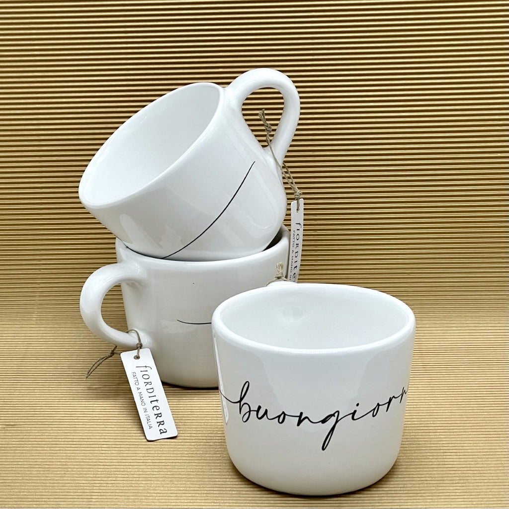 Tazza da colazione in ceramica della linea CALLIGRAFA di FIORDITERRA. La semplicità delle proporzioni unite alla "bella grafia" della scritta BUONGIORNO, rendono questa tazza ideale per la tua colazione, per una tisana o per una cioccolata calda!