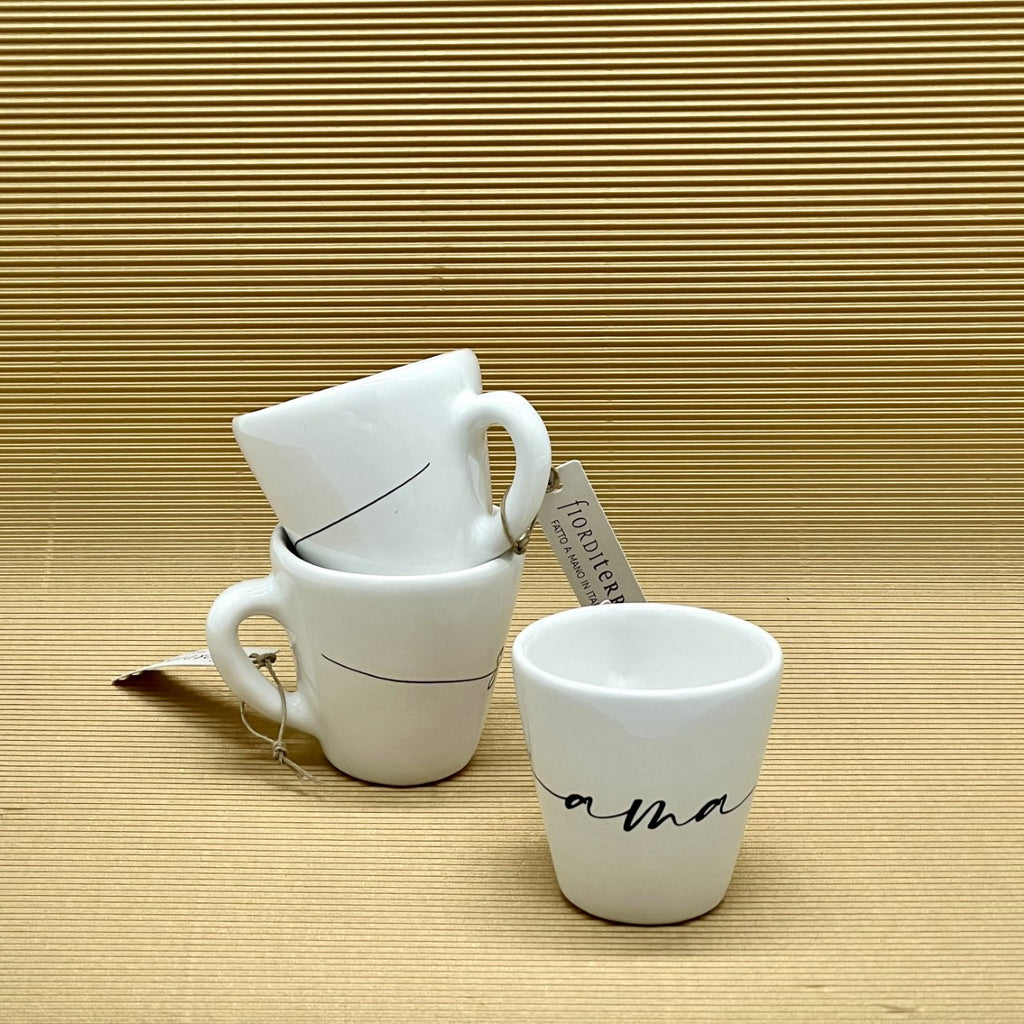 Tazzina da caffè in ceramica della linea CALLIGRAFA di FIORDITERRA. La semplicità delle proporzioni unite alla "bella grafia" della scritta AMA sono il tratto distintivo di questa tazzina destinata a diventare la tua preferita. Scopri anche le altre scritte e collezionale!