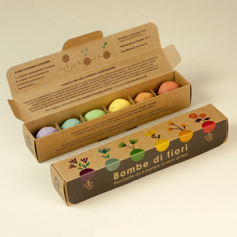 Questo pacchetto è composto da 6 bombe di semi di fiori selvatici. Un regalo ideale per riconnettersi con la natura e riempire le case di colore.
