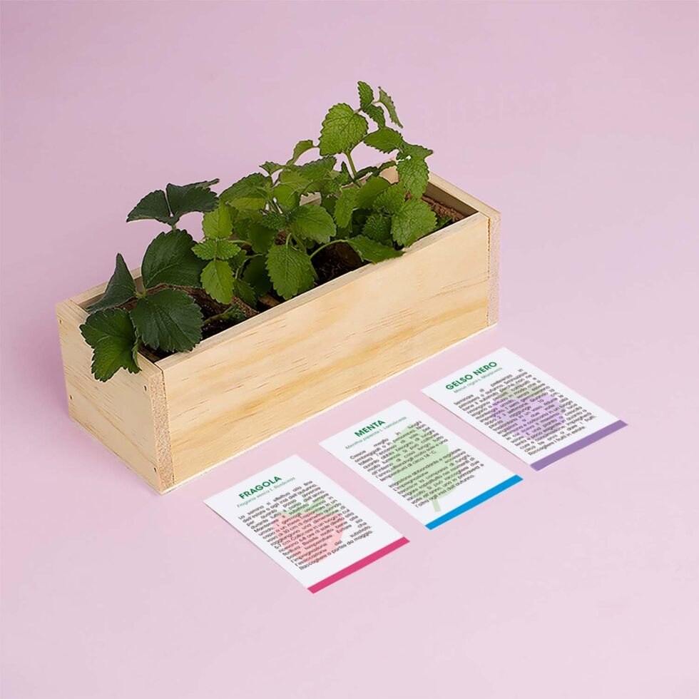 Il Kit Dolci contiene tutto il necessario per la coltivazione di fragole, menta e gelso nero: 3 vasi di germinazione 100% biodegradabili, 3 pastiglie di torba, 3 bombe di semi avvolte in carta velina e 3 schede con le cure necessarie per ogni pianta.