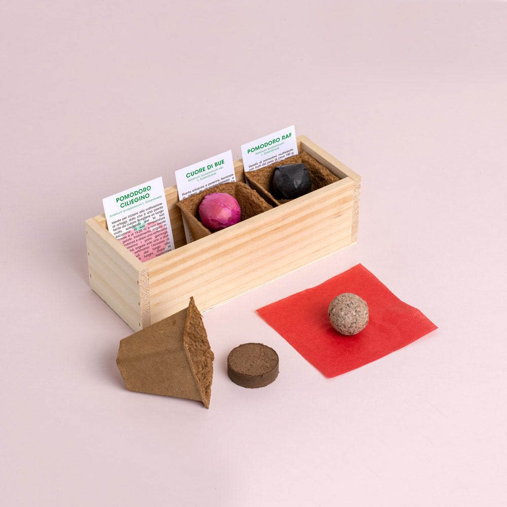 Contenuto: 3 bombe di semi di pomodoro ciliegino, cuore di bue e raf, 3 vasi di germinazione 100% biodegradabili, 3 pastiglie di substrato e 3 schede di coltivazione.